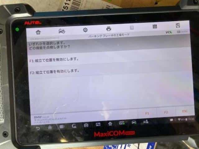 電動パーキングブレーキ車両では、作業後にテスターでの初期化・作動確認が必須です。専用診断機を用いて、パーキングブレーキの位置学習とエラーコードの有無をチェックし、問題がないことを確認して作業完了となります。